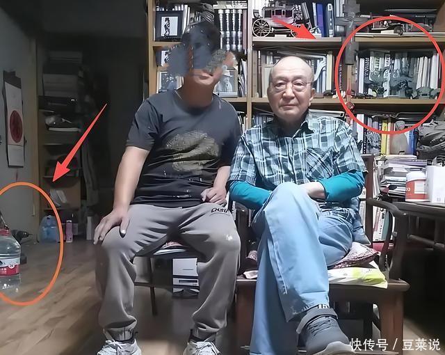 照片里,他内搭蓝绿色长袖,外穿皱巴巴的黑白格子衬衫短袖,水蓝色牛仔裤膝盖处洗得发白,脚上的鞋子早已分辨不出原本的颜色。 令人惊讶的是,在这位老艺术家的家中,书架上堆满了书籍和各种小物件,显得杂乱无章,墙角鞋柜上的鞋子也摞得参差不齐,而地上随意摆放的瓶瓶罐罐中,两元一桶的桶装水格外醒目。